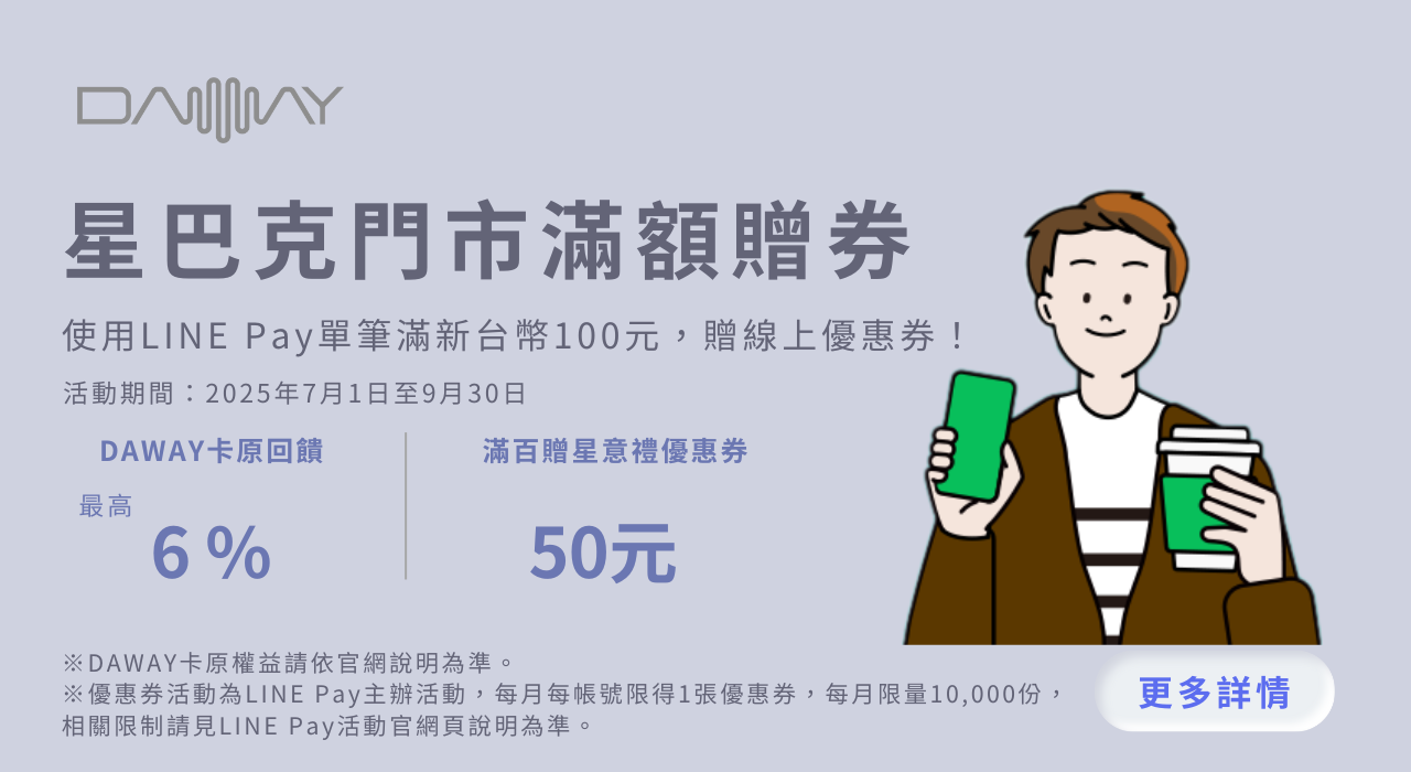 - 星巴克-我的會員卡:每週五儲值LINE Pay星巴克會員卡,贈50元優惠券1張(每帳號每月限得一次,單筆滿90元可折抵,每月限量6,000份)