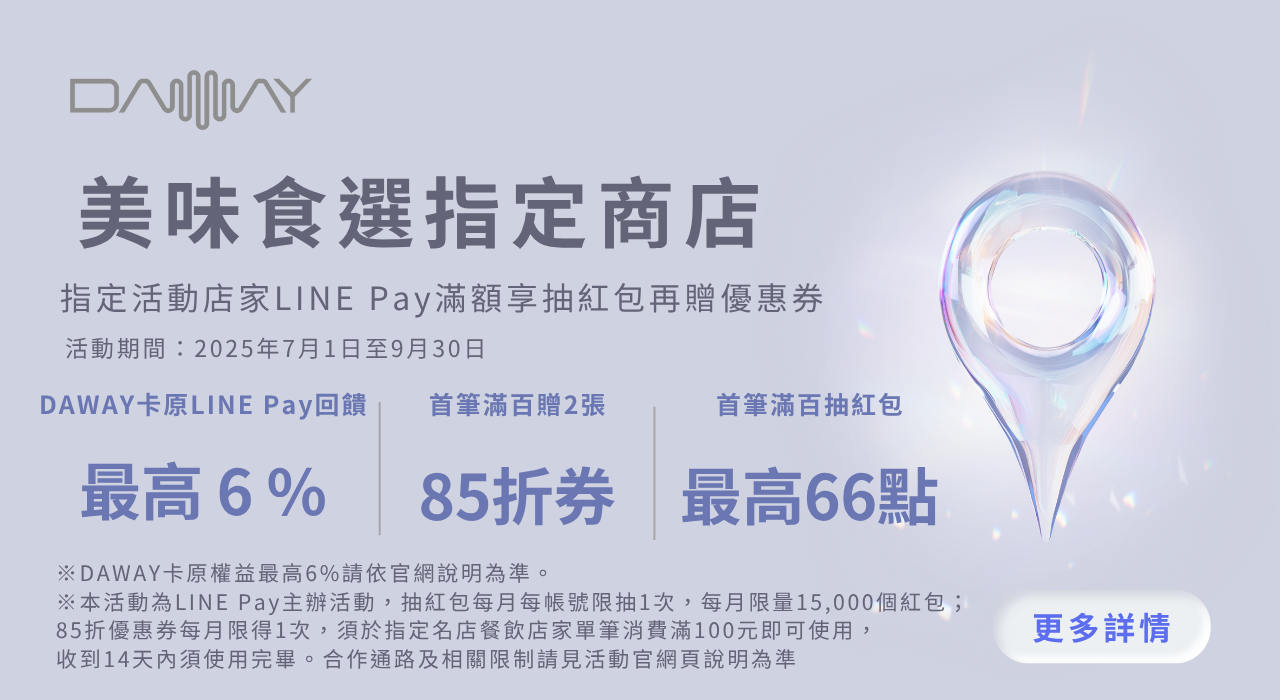※ 韓國指定商店DAWAY卡LINE Pay加碼最高2.5%,每帳號每月最高限得750點,活動每月總回饋上限30萬點。