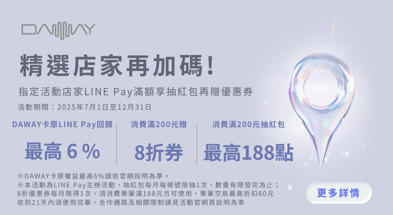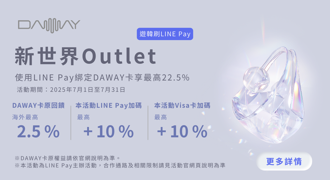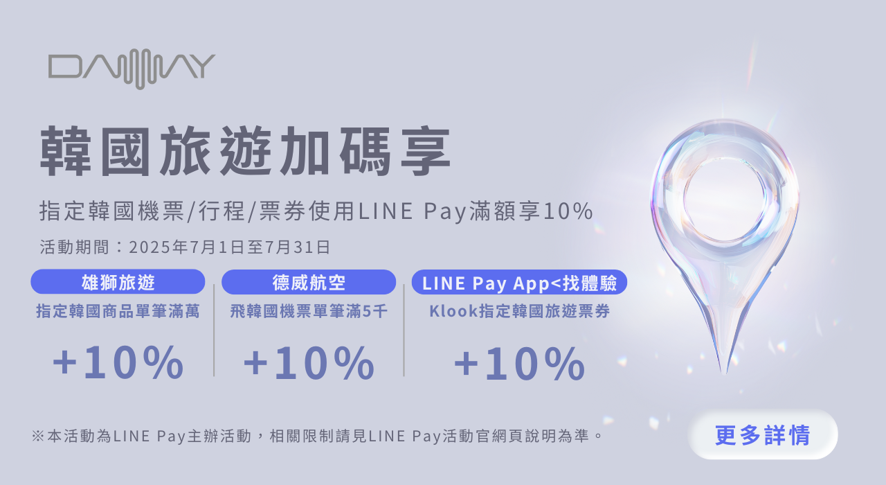 - 活動內容:於韓國當地指定商店,使用LINE Pay綁定DAWAY卡消費,享加碼最高32.5%!