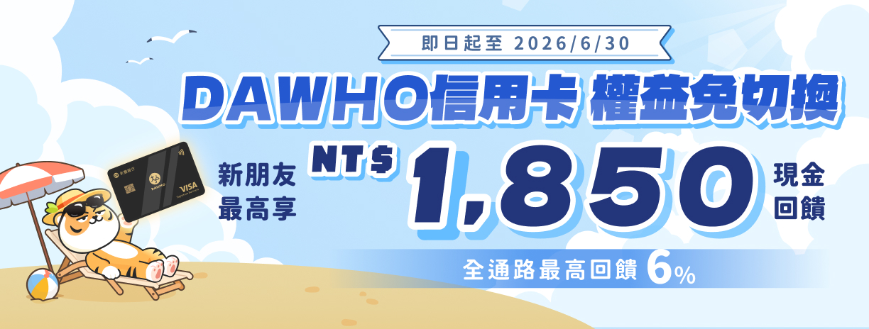 了解更多&登錄活動:DAWHO信用卡權益免切換|新朋友最高享1,850元現金回饋!