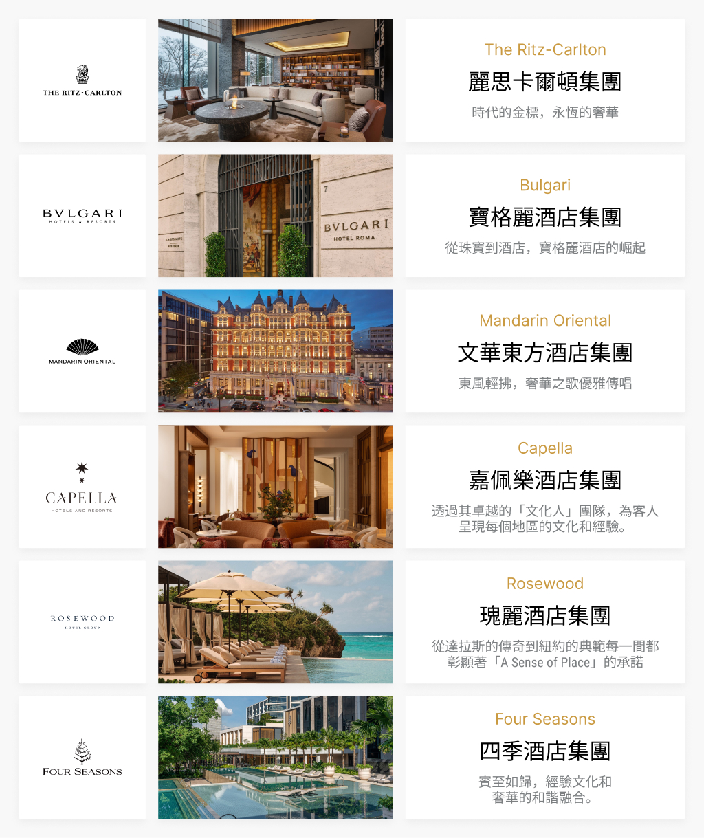 - 國際飯店預訂:Mandarin Oriental Hotel Group文華東方酒店集團、 Marriott International萬豪酒店集團、InterContinental Hotels Group plc洲際酒店集團、Hyatt Hotels Corporation凱悅酒店集團、Hilton Worldwide Holdings Inc. 希爾頓酒店集團、Preferred Hotels & Resorts璞富騰酒店及渡假村、Belmond貝爾蒙德、Rocco Forte Hotels 羅科福爾蒂酒店、Dorchester Collection多切斯特酒店...等50個酒店集團。