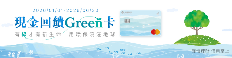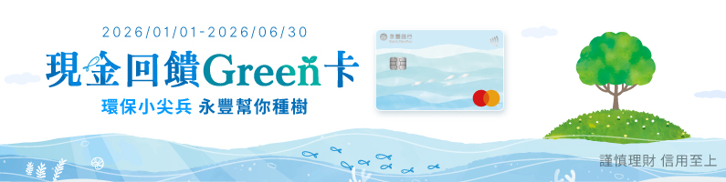 - 消費日於2025/12/31前(含)適用2025年下半年公告之「精選國內綠色通路」,消費日於2026/01/01-2026/06/30適用2026年上半年公告之「精選國內綠色通路」。