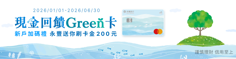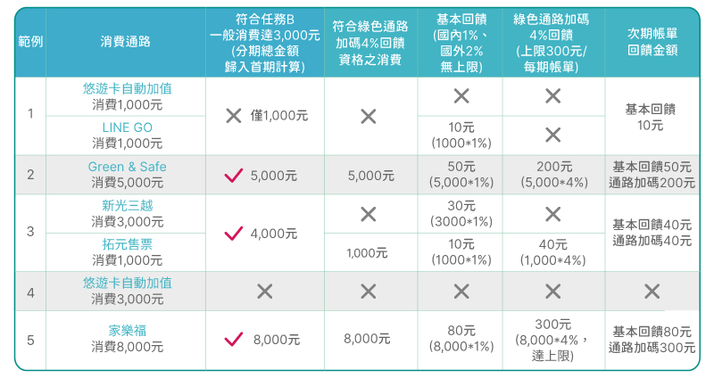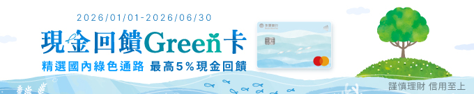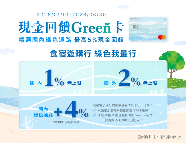 - 跨月消費回饋說明:設定電子或行動帳單,且當期帳單(例如:2026年2月帳單中之2026年1月及2月消費合併計算)之現金回饋Green卡新增一般消費累積滿新臺幣3,000元(含)以上,當期帳單符合「精選國內綠色通路」之消費享加碼4%現金回饋。