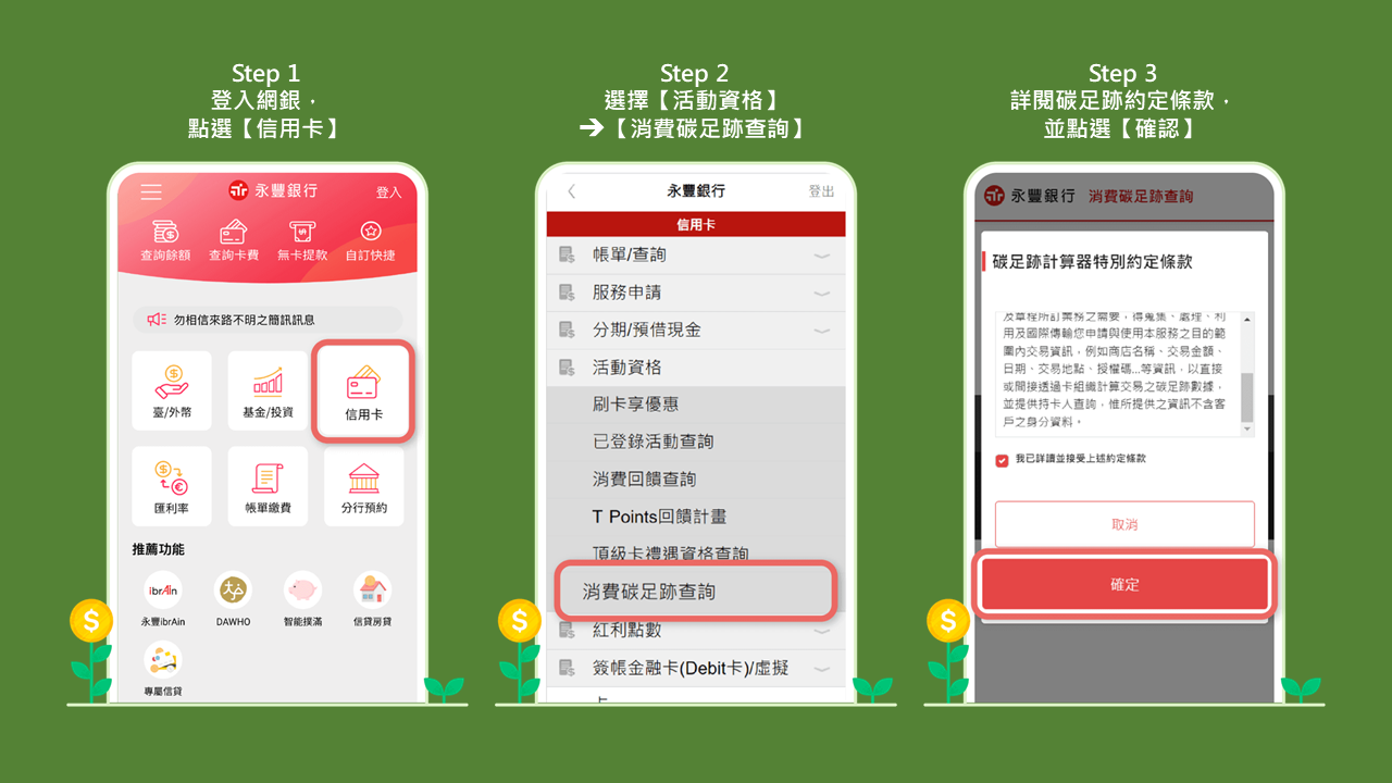 ※可透過【MMA金融交易網】或【永豐行動銀行APP】查詢消費碳足跡