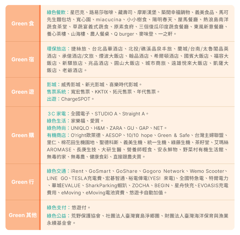- 「精選國內綠色通路加碼回饋4%」精選國內綠色通路明細如下:
