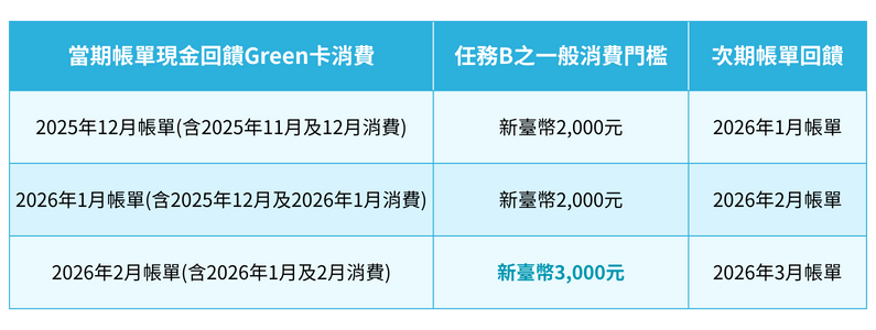 *任務B:當期帳單之現金回饋Green卡新增一般消費滿新臺幣3,000元(含)以上