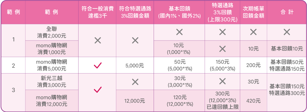 - 當期現金回饋金額係依據「當期帳單累計新增一般消費」扣除所有負項交易(包含退貨、帳務調整金額、調減金額等)乘以各卡別活動之回饋百分比率計算回饋金額。消費以實際有效交易計算,若付款失敗、訂單取消或其他原因,該筆交易將不列入計算範圍,持卡人如於回饋前有停卡、延滯繳款或其他違反信用卡契約之情事者,將喪失回饋資格。
