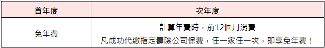 -除前述辦法,保倍卡凡成功代繳指定壽險任一家任一次,亦免收次年年費。