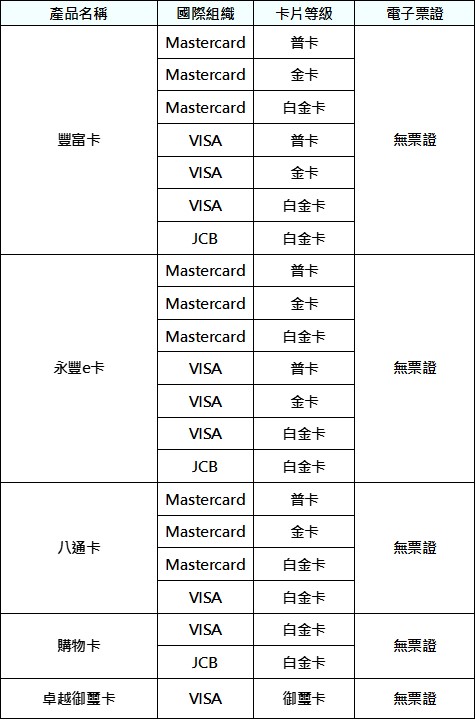 永豐E卡、Vogue聯名卡、美樂家聯名卡、永豐卓越卡、豐富卡、八通卡、永豐購物卡、美麗華聯名卡、中興大學認同卡、美安聯名卡、財富無限卡、世界卡、55688、Me Card、保倍卡、鈦豐卡、三井聯名卡