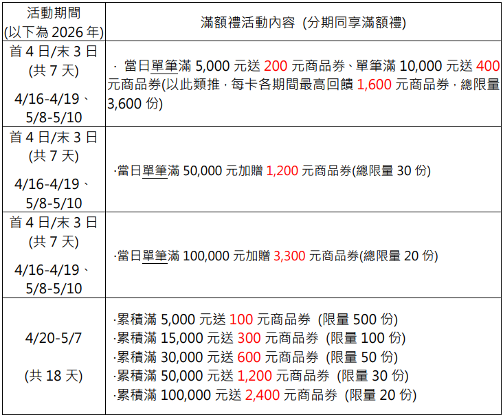 - 「3期分期自由選」優惠活動期間至2026年6月30日,以消費日為準,若有延長以本行網站公告為準。