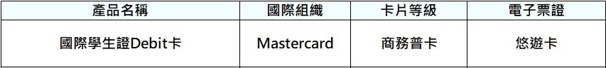 國際學生證Debit卡結合金融卡、簽帳卡、國際學生證及悠遊卡(普通卡)之多合一卡片。需申請國際學生證資格並取得核准編號始得申請。