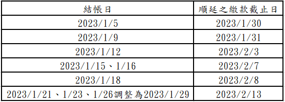 2023/1/20~2023/1/29適逢春節假期,為不影響部分客戶繳款,本行一月份信用卡帳單將做部分調整:
