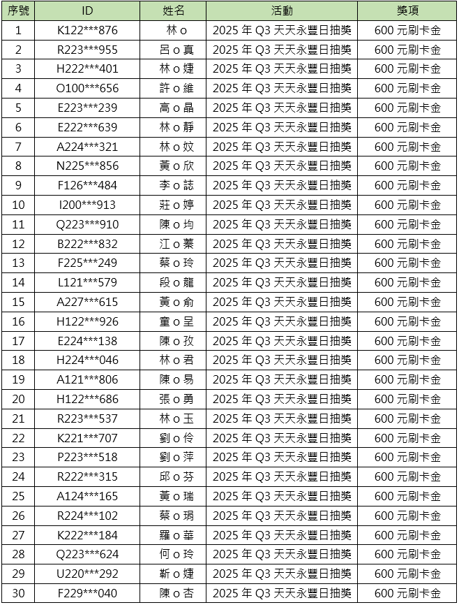 本次獎金項目為永豐銀行「刷卡金」,並回饋至有效正卡人之信用卡帳上,符合敘獎者需持有本行信用卡方可回饋。活動獎金將於2025年12月起每月陸續匯入200元至得獎人信用卡帳上,連續3個月共600元,不得指定回饋月份、轉讓、折現或兌換其他商品。 - 「2025年Q3天天永豐日抽獎活動」中獎名單: