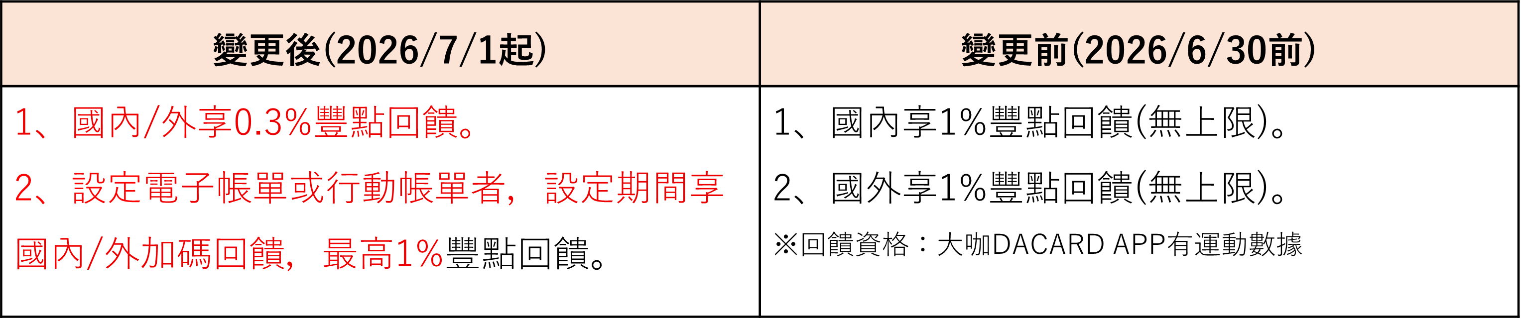 感謝您對永豐SPORT卡、夢行商務鈦金卡的支持與愛護,本行自2026年7月1日起將調整「一般消費回饋」及「加碼回饋資格」。詳細變更內容請參見下述「一般消費回饋變更對照表」。