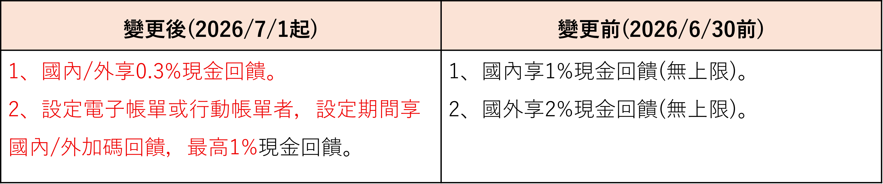 如您對本次變更之優惠內容有任何異議,得於本次修訂生效日2026年6月30日(含)前,依信用卡契約約定條款第二十三條之約定通知本行終止契約;倘您未表示異議,則視同您同意本次修訂之內容。