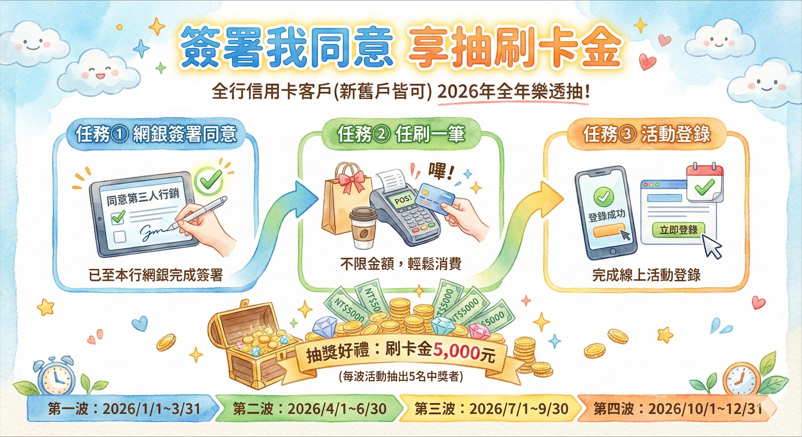 - 本活動限2026/1/1~6/30申請信用卡正卡進件(以本行收件日為準),並於2026/7/15前核卡者。