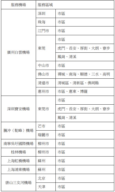 11. 接或送地點:由持卡人本人指定單一定點100公里(含)以內接或送服務,超過100公里後之里程,每一公里加收人民幣5元,並由卡友直接支付予接送機服務之司機。