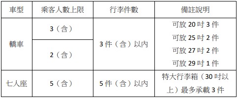 16. 同行人數:除限定正卡持卡人本人使用外,如行李加上同行家人或友人未超過車輛所乘之範圍內,皆可一同搭乘,但以一車為限。(一車限定人數依交通法規規定,客服中心保留接受同行人數之權利)