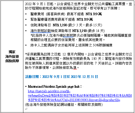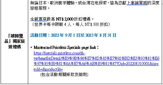 永豐MasterCard 世界卡持卡人享以下優惠。