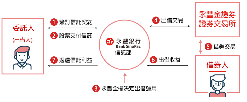委託人將中長期持有之股票信託移轉予受託人(銀行),由受託銀行全權辦理信託股票之出借運用,賺取出借收益,並約定信託期間股票之收益,包括配股配息及出借收入,皆由委託人享有。
