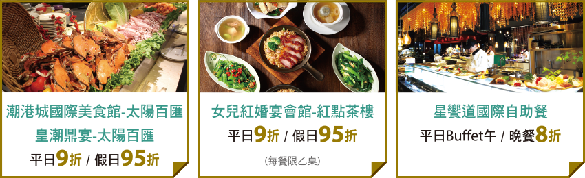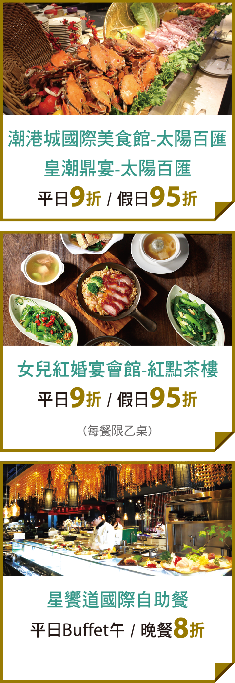 ※活動期間:即日起~2019/12/31止,使用前請主動告知使用本優惠。優惠不併用,優惠折扣不包含10%服務費。特殊節日不適用,平日/假日/特殊節日定義及詳細優惠辦法依各店家公告為準。潮港城/皇潮鼎宴優惠:每卡提供5人。