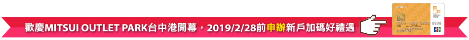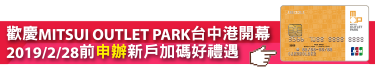 ※活動期間:即日起~2019/3/31,限永豐MITSUI OUTLET PARK 聯名卡JCB卡適用。