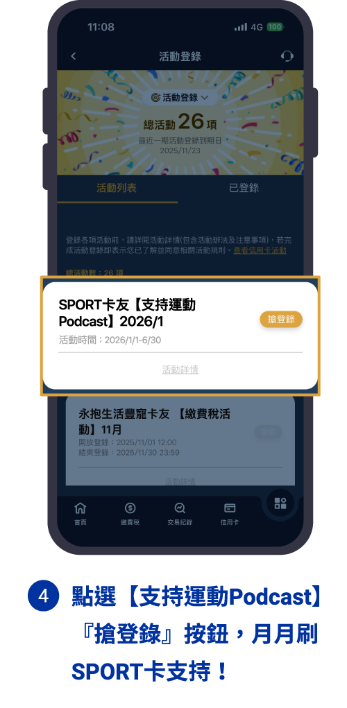 活動參與資格:本活動報名不限「永豐SPORT卡」卡友,惟須於【支持運動Podcast】每月登錄活動截止前申請「永豐SPORT卡」核卡完成並成功登錄活動,同時須於大咖DACARD