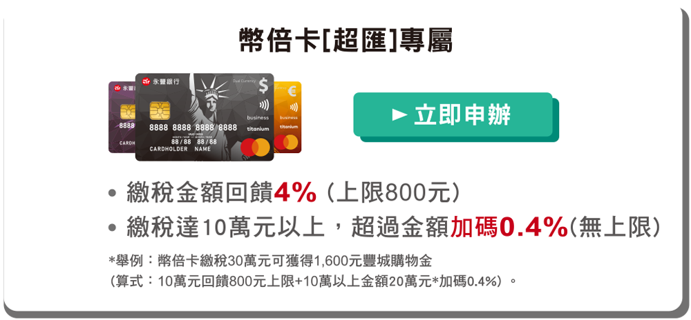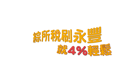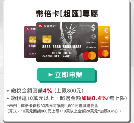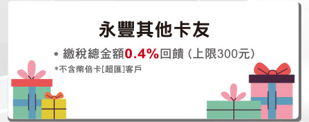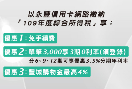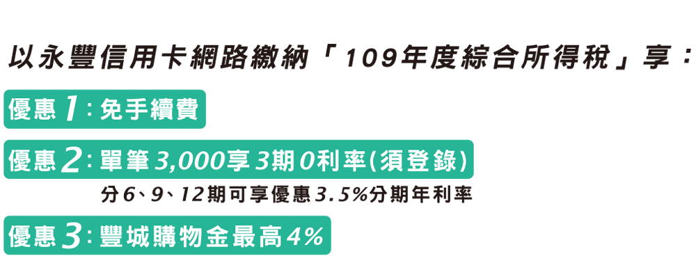 - 繳稅金額若需分期服務,需於活動期間內登錄且符合資格,方享3期分期0利率資格。3期分期0利率,係指申辦「單筆分期」享3期免息免手續費,限透過Paytax繳稅服務網(含網路、QR CODE及中華電信語音等繳稅方式)以永豐信用卡繳納綜所稅,單筆金額須滿3,000元以上完成網頁登錄且簽署"消費分期約定事項",方享3期分期0利率資格。本分期付款係由本行一次墊付國稅局,並由持卡人分期繳付稅款予本行。公司卡、配銷卡、儲值卡、簽帳金融卡恕不適用3期分期0利率。
