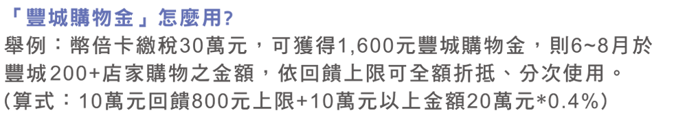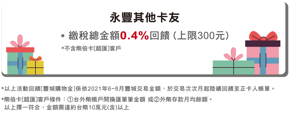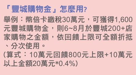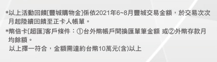 - 依據持卡人2021年6~8月的豐城消費,本行於2021年8月起逐月回饋前前月之豐城消費金額(8月回饋6月豐城交易金額,9月回饋7月豐城交易金額,10月回饋8月豐城交易金額),回饋金額上限以繳稅符合獲得之刷卡金為主。若2021年6~8月豐城交易金額加總低於獲得之刷卡金,將視同放棄,恕不得要求轉讓、提領或兌現。