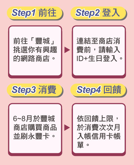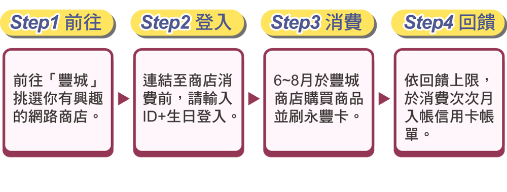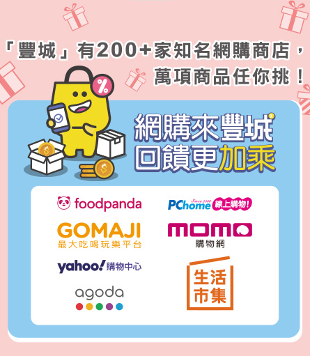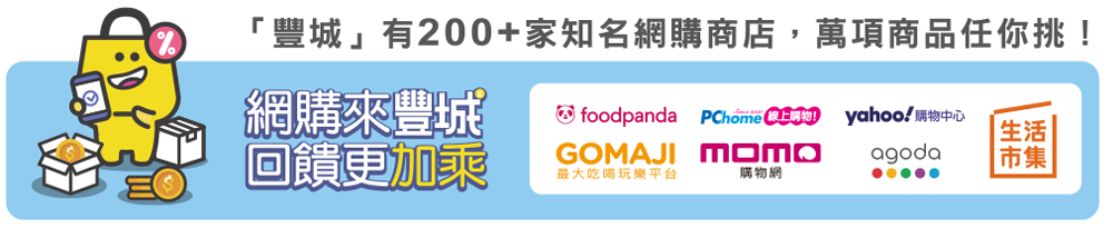 - 豐城消費定義係指登入豐城官網或豐城APP版(汗水不白流APP)後,連結至各商家之消費帳款。2021年8月回饋前已有豐城登入紀錄且有透過豐城連結至各商家之消費帳款,即可符合。各商家僅供參考,豐城保有商家上下架及更替權利。豐城開台慶加碼及相關活動為永豐銀行自辦活動,與商家無涉。