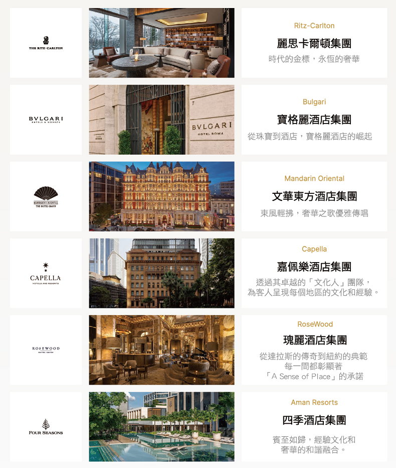 國際飯店預訂:Mandarin Oriental Hotels Grou文華東方酒店集團, Marriott International萬豪酒店集團、The Leading Hotels of the World立鼎世酒店集團、Small Luxury Hotels of the World全球奢華精品酒店聯盟、Preferred Hotels & Resorts璞富騰酒店及渡假村、Belmond貝爾蒙德、Rocco Forte Hotels 羅科福爾蒂酒店、Dorchester Collection多切斯特酒店...等50個酒店集團。