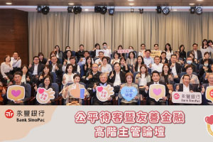 永豐銀行於10月30日舉辦「公平待客暨友善金融高階主管論壇」,由永豐銀行全體董事會成員、高階主管及各單位公平待客專責主管及窗口出席,邀請文化大學永續創新學院院長方元沂說明國際金融消費者保護及公平待客發展趨勢,針對防制詐騙及申訴保障機制健全性等議題進行深入探討,充分展現永豐銀行多面向推動公平待客之決心。
