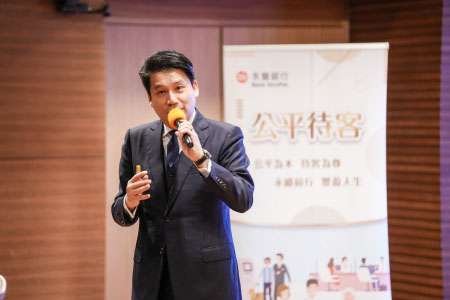 5月8日辦理「董事及高階經理人公平待客論壇」,邀請普華商務法律事務所律師團隊演講,由董事、高階主管帶領主管同仁,上而下精進「身心障礙者權利公約(CRPD)」內涵,了解國際金融消費者保護政策發展,持續實踐「同理待客」、「防制弱勢剝削」、「保護到培力」的永續友善金融環境。