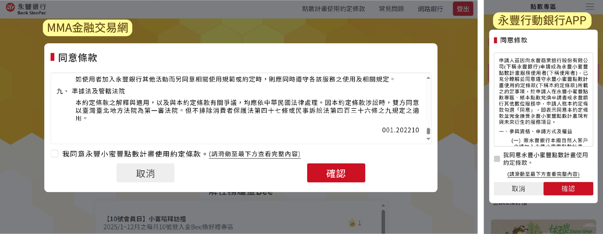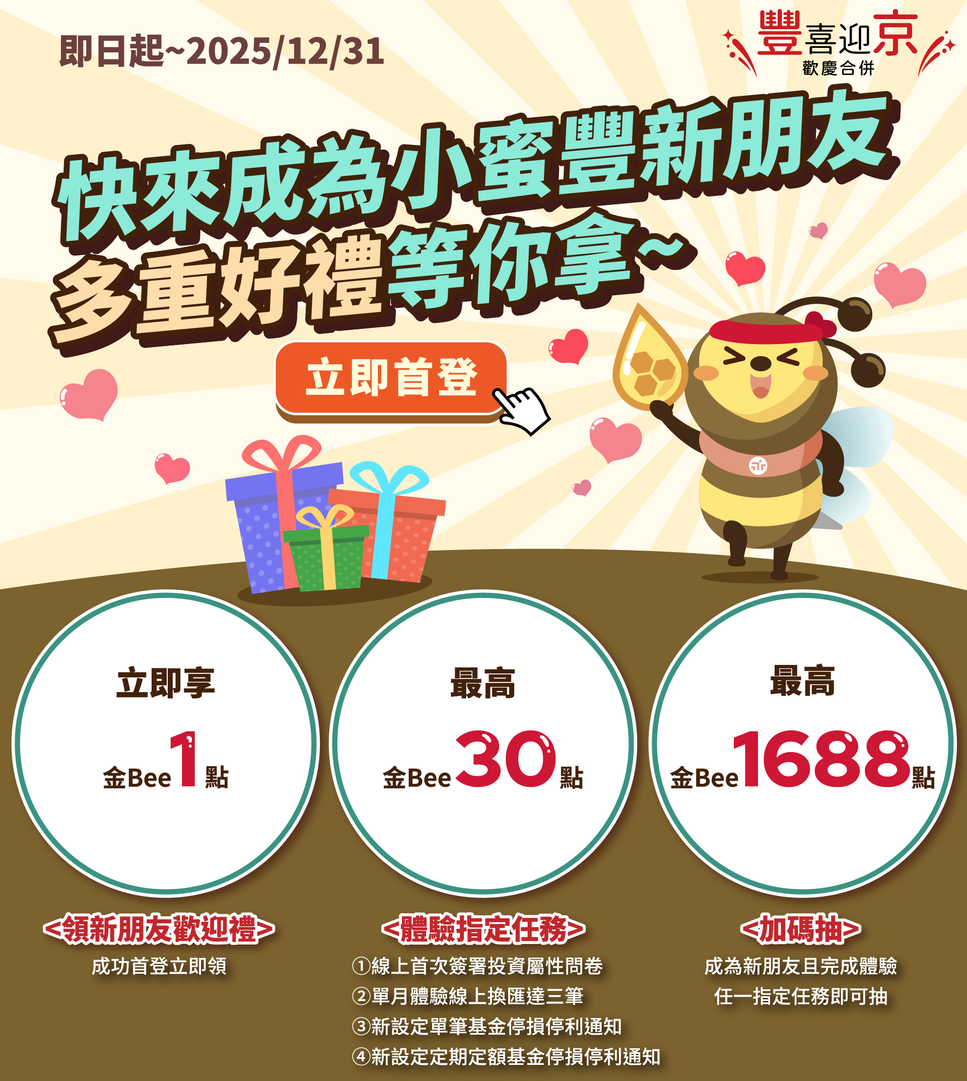 【領新朋友歡迎禮】活動期間首次登入小蜜豐點數專區(MMA金融交易網或永豐行動銀行)並同意點數使用約定條款,即可獲金Bee 1點(限量3萬份,每人限回饋一次)。