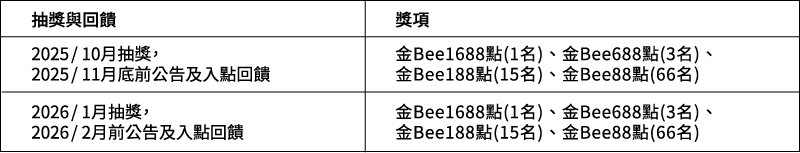 【新朋友加碼抽】活動期間成為小蜜豐新朋友並完成體驗任一指定任務,即可獲得加碼抽獎機會乙次(各項任務每人限獲得乙次抽獎機會,同一人最高累積抽獎機會四次),獎項包含金Bee1688點、金Bee688點、金Bee188點及金Bee88點。
