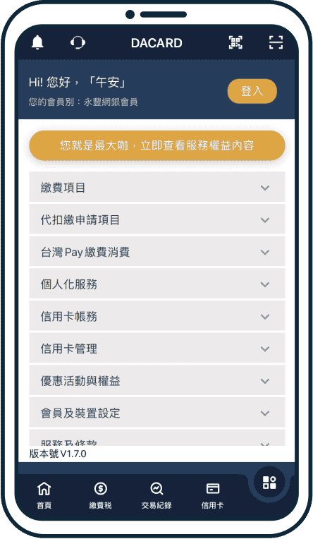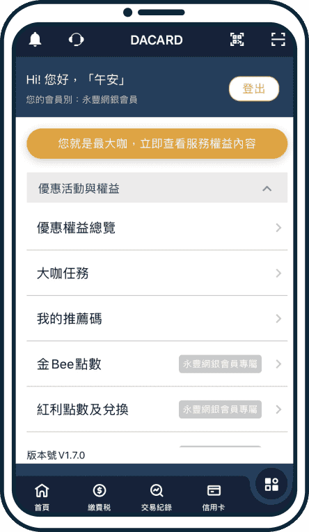 在活動期間內,只要以永豐網銀會員身分(限本國自然人)登入大咖DACARD App,不限(自行/他行)信用卡、 (自行/他行)帳戶或掃碼進行繳納都符合活動資格。