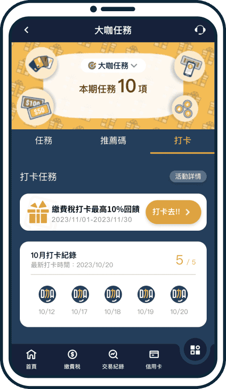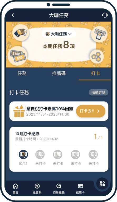 1大大於2023/11/1登入大咖DACARD App且成功繳費一筆(非自動扣繳交易)並於2023/11/2打卡乙次