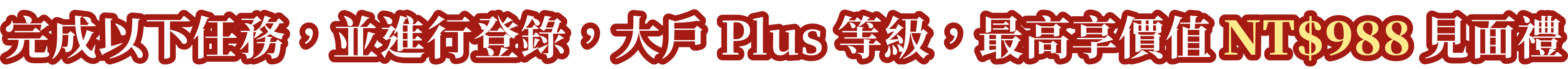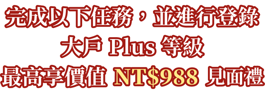 完成以下任務,並進行登錄,大戶 Plus 等級,最高享價值NT$988見面禮