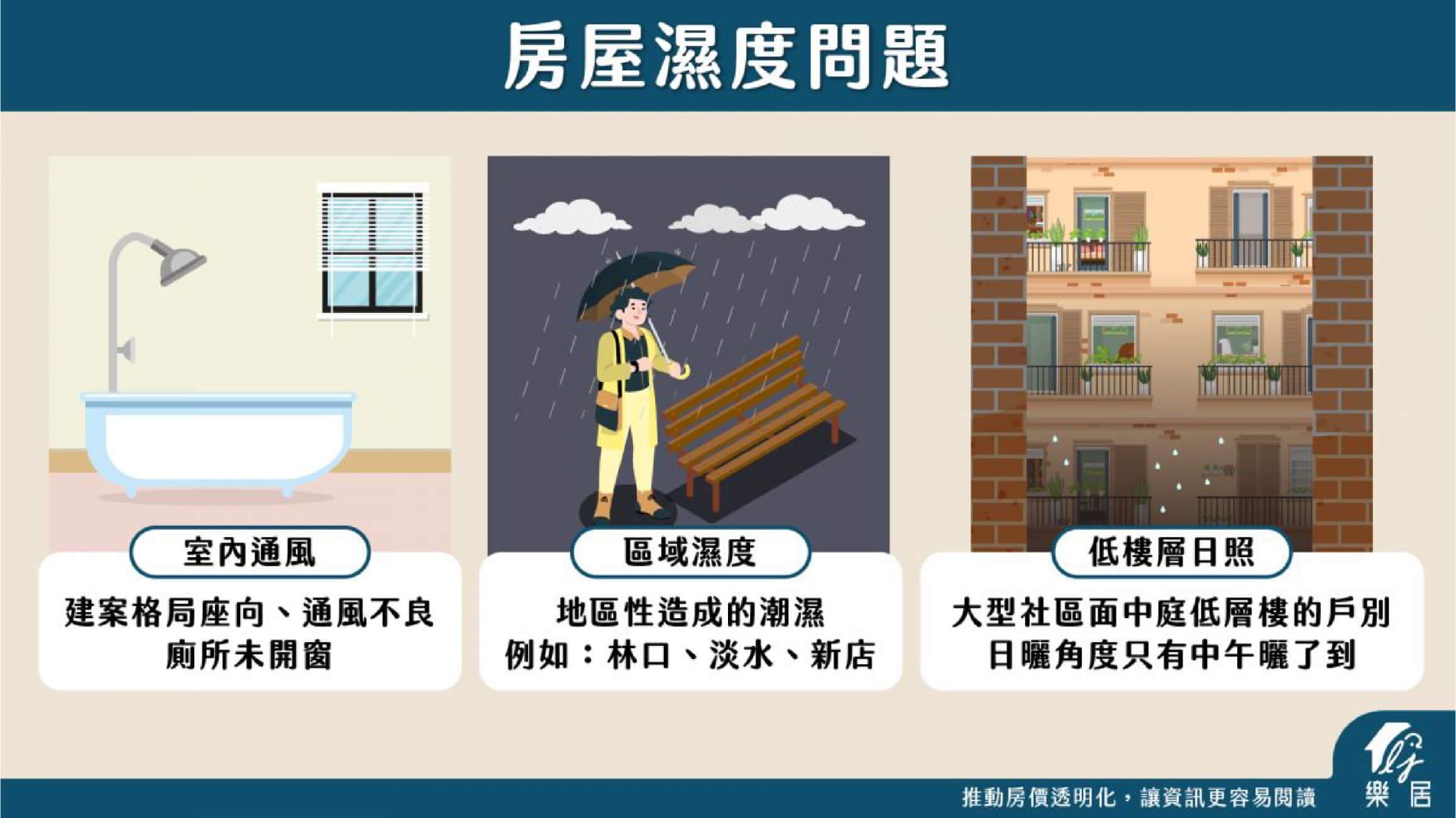 地區性所造成。例如林口、淡水、新店相對其他區域潮濕,當然也有可能會因為建案不同方向,相對濕度上並非這麼濕。