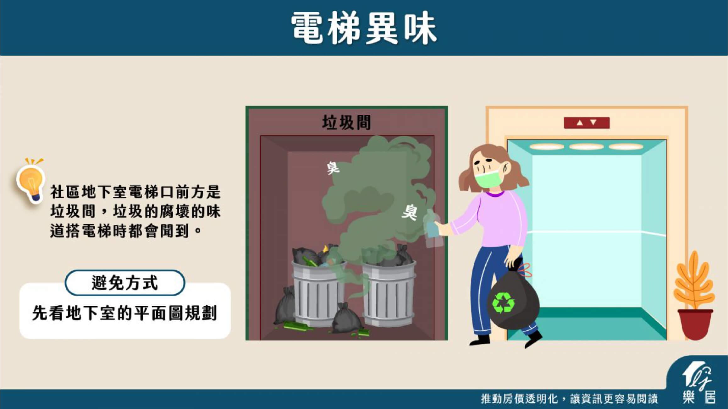 社區的垃圾間規劃位置非常重要,有的社區地下室電梯口前方就是垃圾間,可能會有垃圾的腐壞的味道,這會導致搭乘這支電梯的住戶,隨時都會聞到飄散出垃圾的異味。