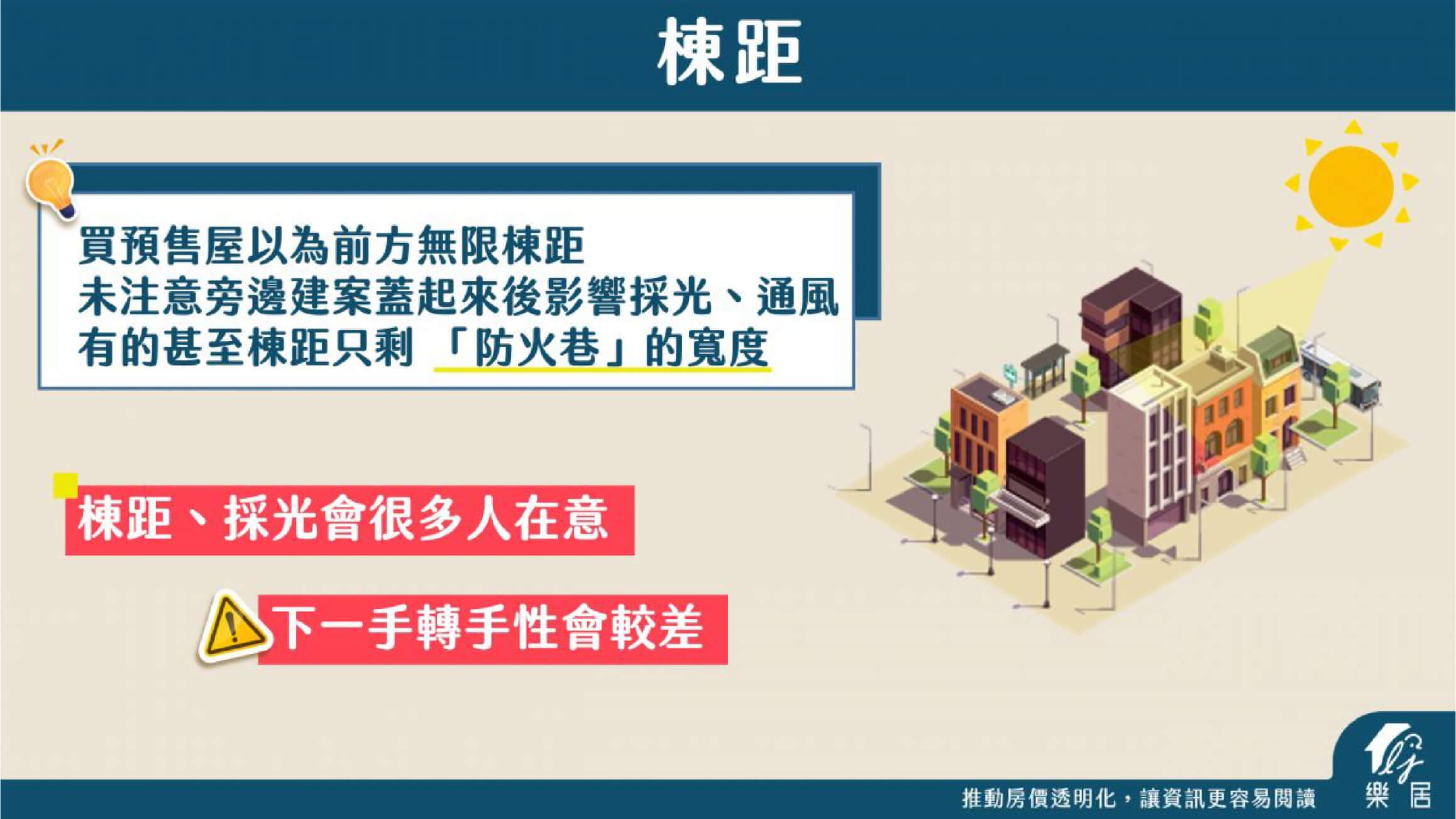 要留意的是,棟距採光的問題,是蠻多人入手買房的考量點,因此,如果發生這樣的狀況要脫手,在下一手的轉手性可能較差,會被買方拿來做為議價的手段。