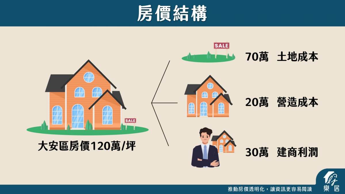 例如台北市大安區房價一坪是120萬,可以分拆成70萬是去買土地的,20萬是拿去蓋房子的,另外,30萬是建商要拿走的。