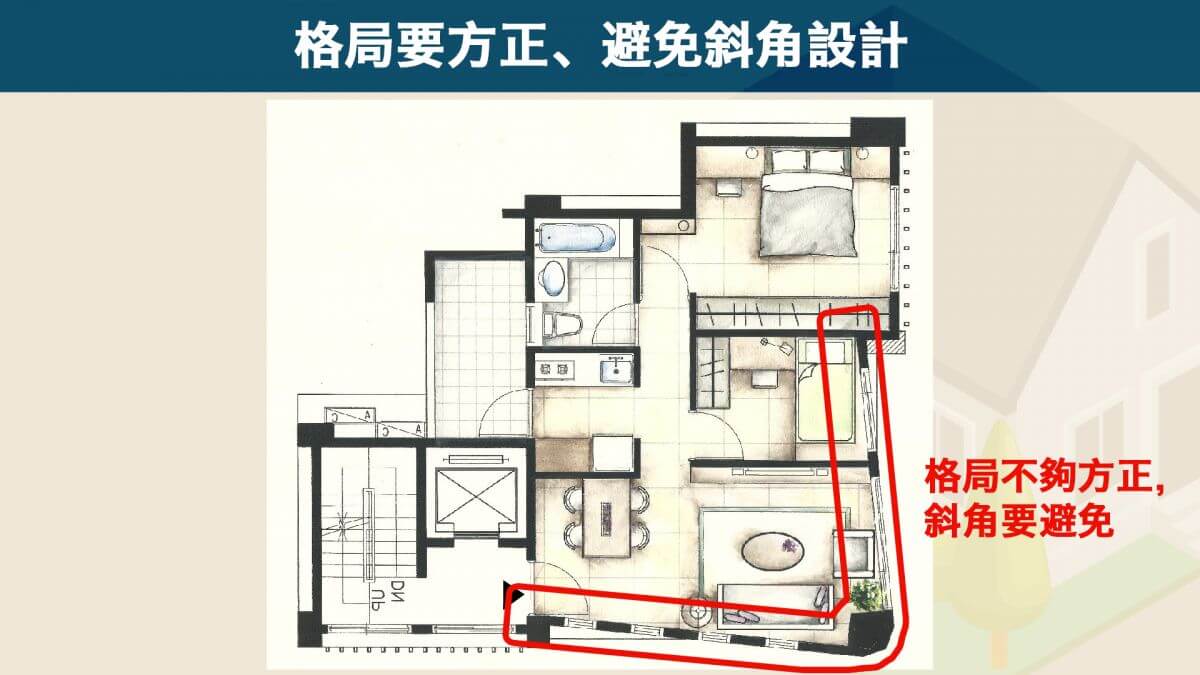 在台灣格局方正還是很重要的一件事,有斜角、圓弧型的在房子轉手時會被議價,盡量不要選擇。