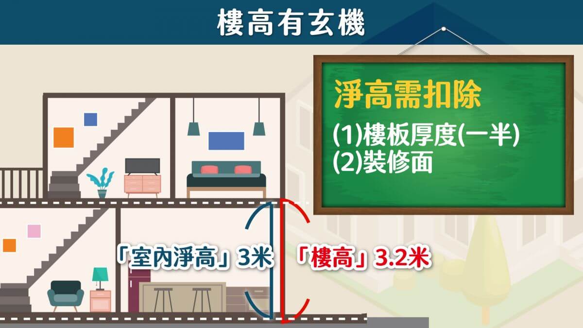 而室內淨高要用樓高再減掉樓板厚度的一半及裝修面,約需要再扣除掉20-30公分,才會是真正的室內淨高。兩個名詞需要把握清楚,才不會造成誤會。