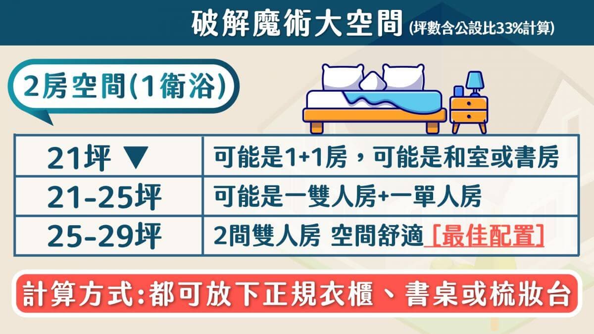 3. 25-29坪:兩房情況下的最佳配置,可以有2間雙人房,且居住空間舒適。
