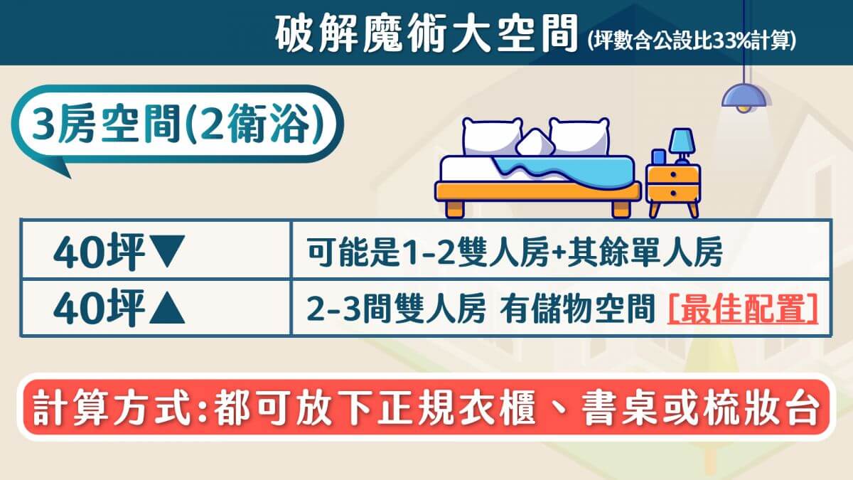 2.40坪以上:3房情況下的最佳配置,可以容納2-3間雙人房並有適當的儲物空間。