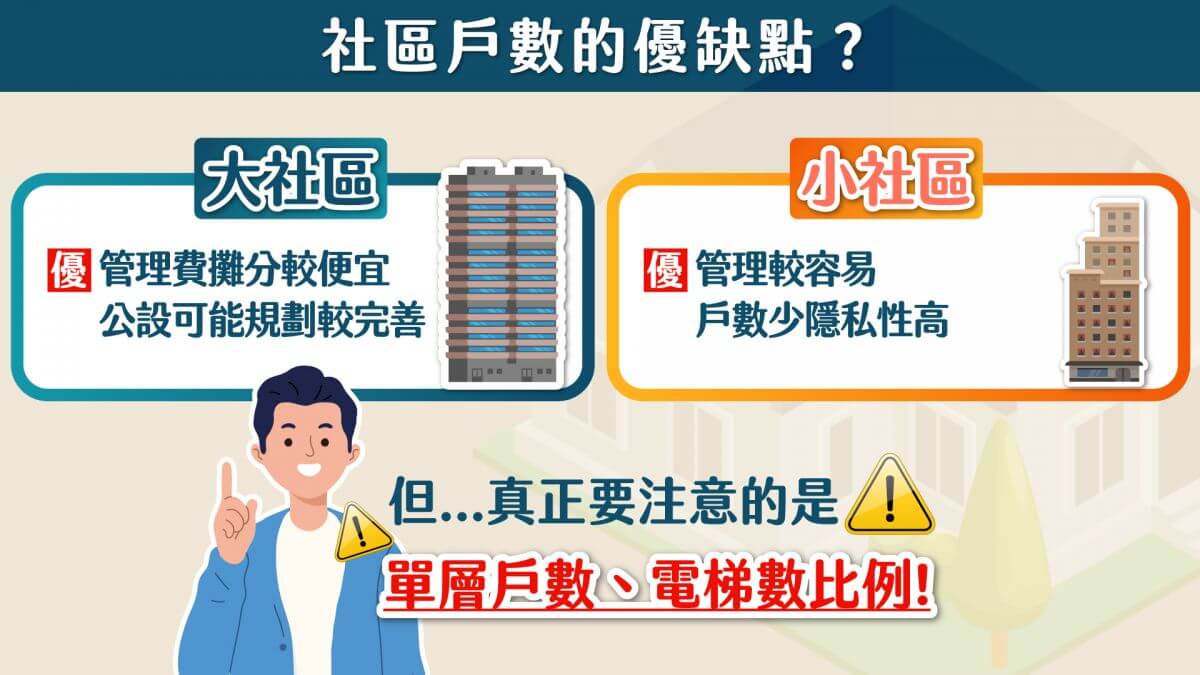 大社區和小社區沒有一定的好壞,可以看個人需求做選擇,但真正需要注意的是單層戶數和電梯數的比例,我們在上一堂課有幫大家做詳細的說明。