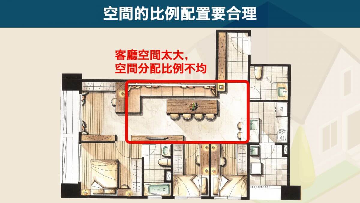 有時候在格局圖上看不出來空間的詳細配置規劃,在傢配圖上就會更清楚一點,像上面這張傢配圖就明顯看得出來客廳比例過大,壓縮掉主臥和房間的收納空間,空間比例配置也是需要特別注意的部份。