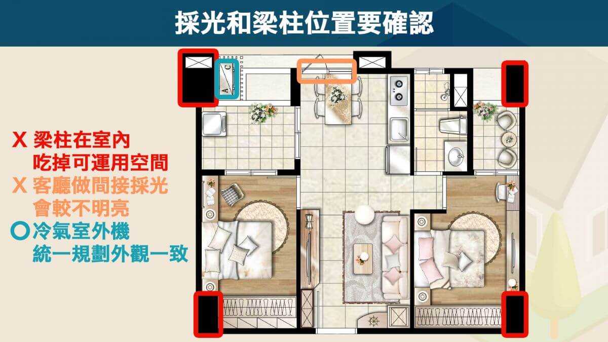 樣品屋通常會利用裝修的手法把梁柱藏起來,有可能就會讓你誤以為這間的格局是沒有梁柱干擾的。建議在看樣品屋的時候一定要比對格局圖或是傢配圖確認,找出梁柱的位置。