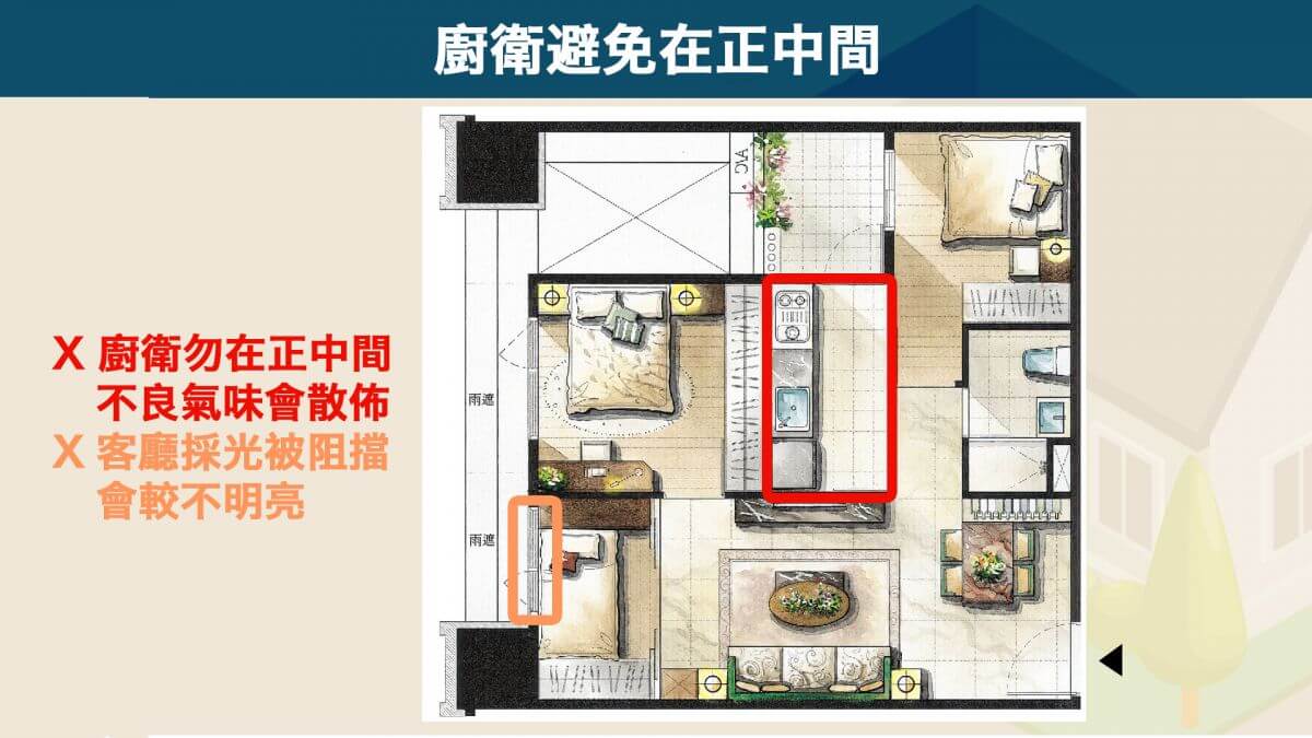 廚房和衛浴如果在房屋格局的正中間,不良的氣味容易沿著管線散佈到周圍其他房間,要避免這種規劃。